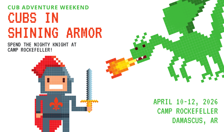 Step into a medieval world of courage and adventure at our Cubs in Shining Armor Cub Adventure Weekend! From April 10th to 12th, your family will join fellow knights, squires, and adventurers for a weekend packed with quests, challenges, and campfire fun.